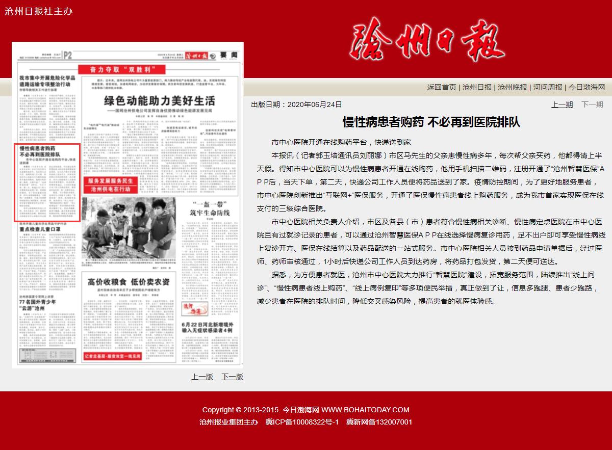 - 2020/06/24 慢性病患者购药不必再到医院排队——沧州智慧医保APP帮您送到家 沧州日报2020-6-24慢性病患者购药不必再到医院排队 市中心医院开通在线购药平台,快递送到家。